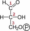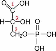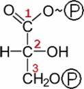 Die Phosphoglycerinsäure (PGS). In der OH-Gruppe am C3 ist der Wasserstoff durch Phosphat ersetzt. Die PGS ist reaktionsfähiger als die Glycerinsäure. Rechts ist die aus-führliche Formel auch für das Phosphat gezeigt. Man sieht, wofür das eingekreiste P genau steht. |