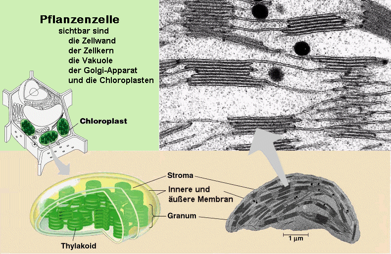 Oben links: Die Pflanzenzelle mit den Chloroplasten oben rechts: ein stärker vergrößertes elektronenmikroskopisches Bild des Thylakoidsystems
