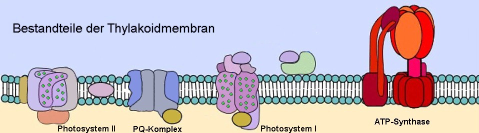 Die lichtgetriebenen chemischen Vorgäng finden hauptsächlich entlang der Thylakoidmembran statt. Wie für biologische Membranen üblich bestehen diese aus Doppelschichten von Lipidmolekülen. Die Funktionen werden aber von Proteinmolekülen ausgeübt, die in die Membran eingelagert sind. Der Photosynthesefarbstoff Chlorophyll – dargestellt durch die grünen Punkte – ist an Proteinmoleküle angelagert und bildet mit diesen zusammen die beiden Photosysteme I und II, welche die Lichtenergie aufnehmen und die chemischen Vorgänge der Lichtreaktion in Gang setzen. Anhand der verschiedenen Farben erkennt man im Thylakoidsystem mindestens 28 (!) verschiedene Proteineinheiten.