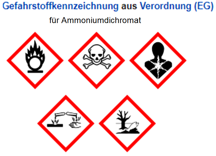 was diese im Einzelnen bedeuten?) verwundert das Verbot nicht. Die Produkte der Reaktion sind zwar beide harmlos, aber der Ascheregen reißt unzersetztes Ammoni-umdichromat mit, das mit dem Chromoxid vermengt ist; auch gefährliche Staubteilchen können verweht werden. Nur, wenn man den Versuch sehr sorgfältig durchführt und sich aller Gefahren bewusst ist, ist das Experiment ungefährlich. Chromate sind gefährliche Krebs-