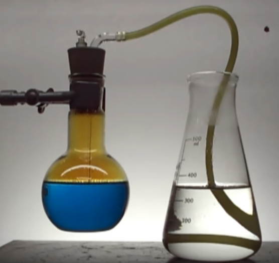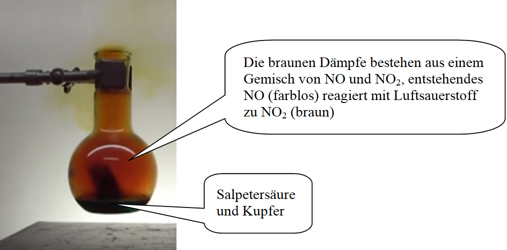 0:44 – 2:00 Ein Behälter mit Wasser wird angeschlossen (rechts). Weil die „Nitrosen Gase“ (NOx = NO/NO2-Gemisch) entstehen.