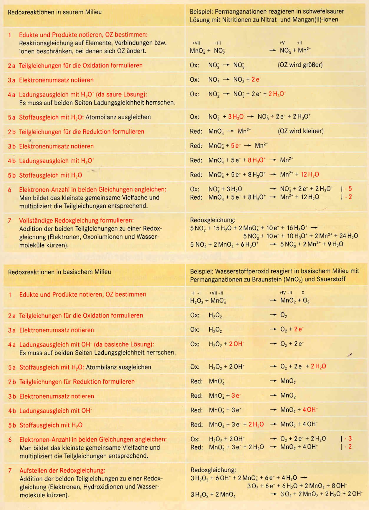 Das folgende Ausgleichsverfahren ist mit der Methode im Buch (rechte Seite oben, Redoxreaktion im Sauren) zu vergleichen. Es ist aber dringend zu empfehlen die Schritte 2a, 3a, 4a, 5a in einer Zeile, und ebenso 2b, 3b, 4b, 5b in einer Zeile zu schreiben, sonst gibt’s nur unnötige Übertragungsfehler…